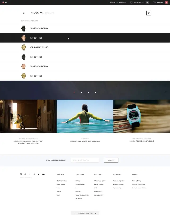 Nixon’s new digital storefront has been completely overhauled for convenience—featuring an intuitive dealer locator, dynamic cart, and predictive search tool.