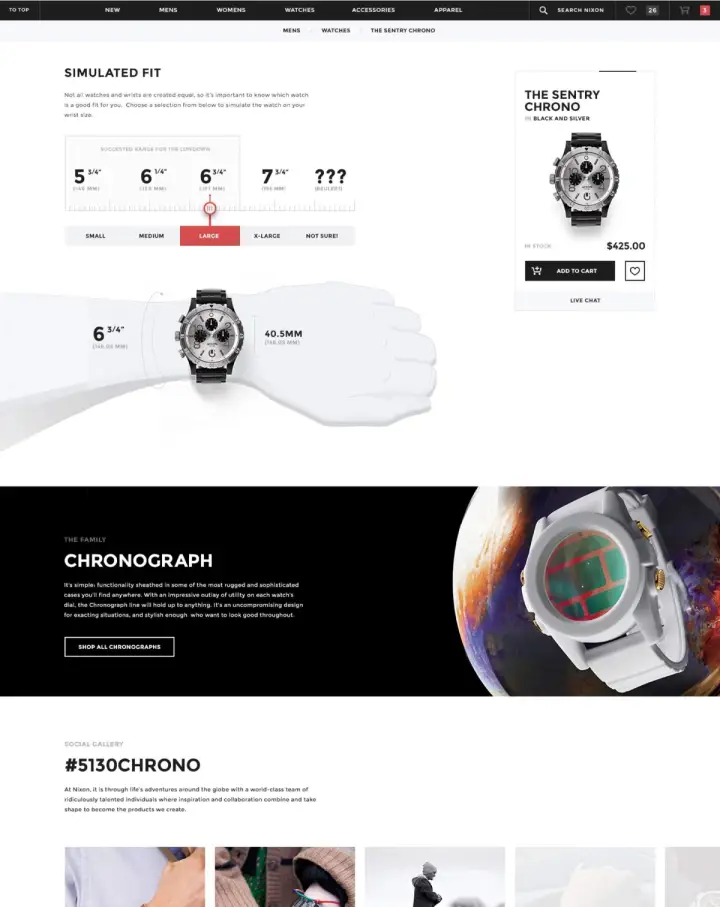 The new page layout communicates Nixon’s handiwork and attention to detail. Its flexible system enables the team to author product-specific pages with ease.