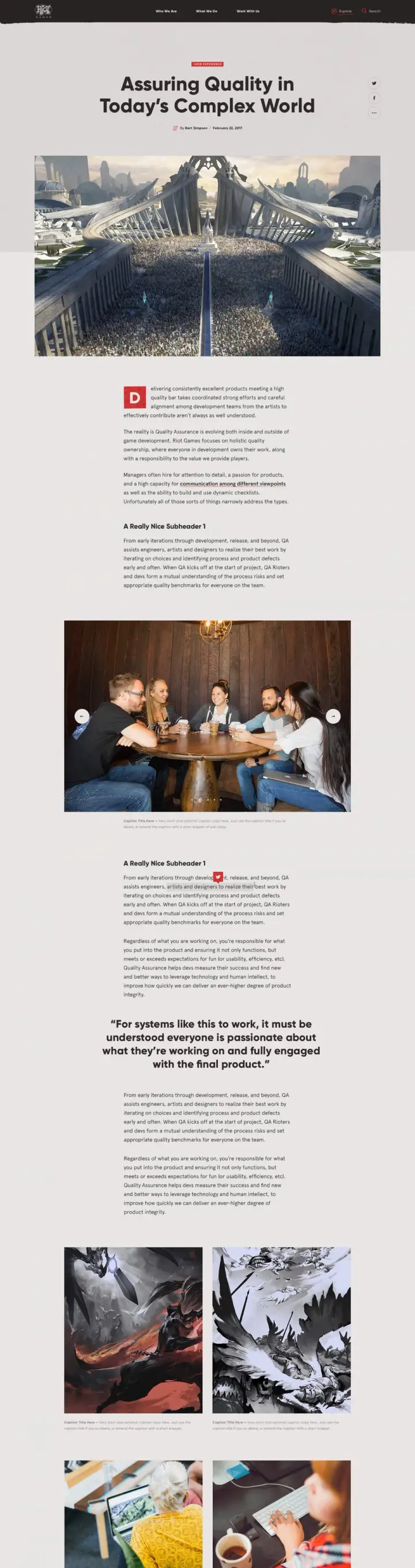 We set out to craft a digital narrative that highlights who the Riot team is, what they do, how they work, and what they believe in. Through this, the goal is to help turn gamers into passionate Rioters. We wanted to create a flexible digital platform that allows the brand to produce meaningful content across the platform. In doing so, we created brand equity and deeper connections with brand fans and potential Rioters around the globe.