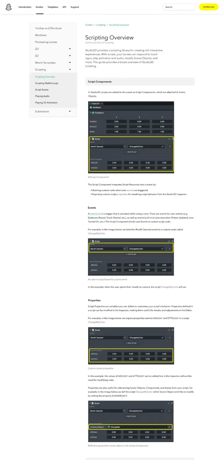 The challenge was to take a dense set of information and create something that could be easily understood by students and engineers alike, toeing the line between pragmatic and playful. Our framework was set up to be a support page for Lens Creators as well as a starting point for those new to the Lens Studio and the world of augmented reality.