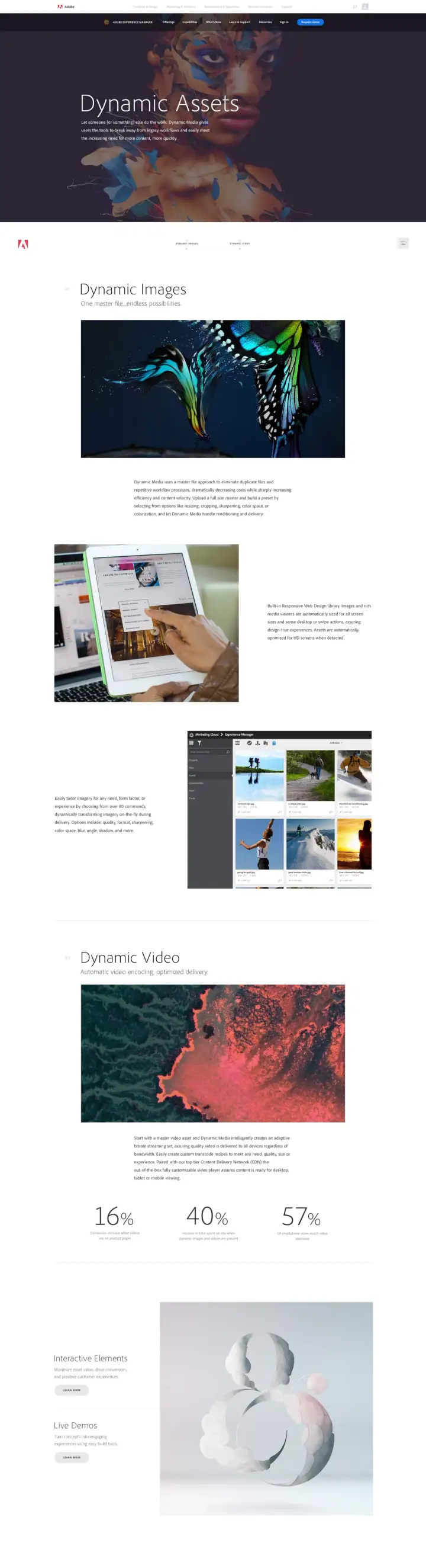 We designed and developed a microsite experience to visualize the power of Dynamic Media. With storytelling at the forefront, interactive demonstrations and rich imagery entice users to sign up and try this cutting-edge solution.